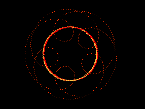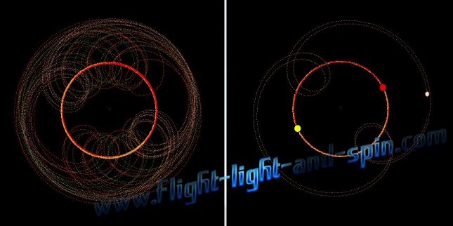 The orbits above are two stars and a planet. The yellow is largest and slowest while the turquoise has medium mass and velocity. The smaller planet is represented by the fastest moving indigo orbit. |