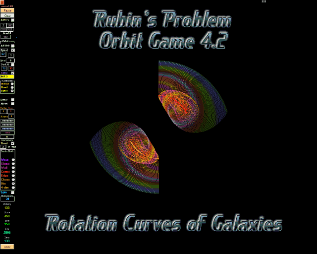 This model represnts the variety of potential orbits in a binary system. Stars that pass between the supermassive white holes are at their slowest in the dead center, explaining why there is little or no velocity at this point. These stars collide with each other, which then gives off the characteristic light bulge at the center of the spiral galaxy. |