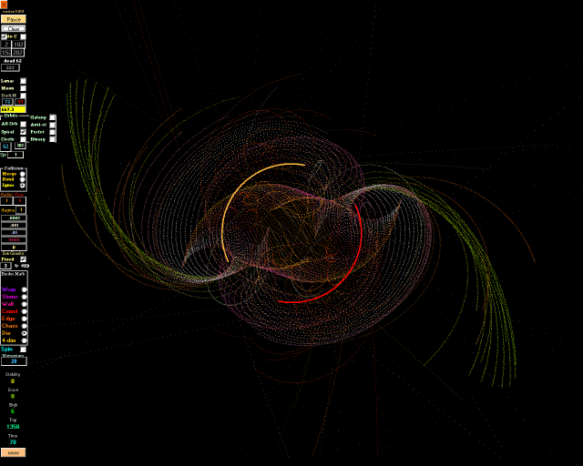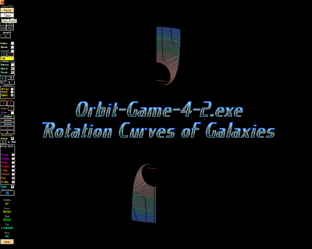 orbit-game-4-3.exe demonstrates how the binary pair move away from each other as they lose mass due to stars having being emitted. Thus stars emitted subsequently are effected by a lesser gravitational force, moving them more slowly. The outer and older stars have often reached escape velocity. |